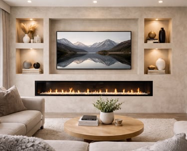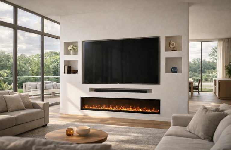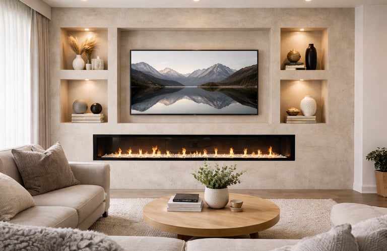 Door het gebruik van hoogwaardige stucwerk afwerking ontstaat een rustige en luxe uitstraling, terwijl de ingebouwde elektrische haard extra sfeer toevoegt aan de ruimte. De symmetrische nissen zorgen voor balans en bieden ruimte voor decoratie of persoonlijke accenten.