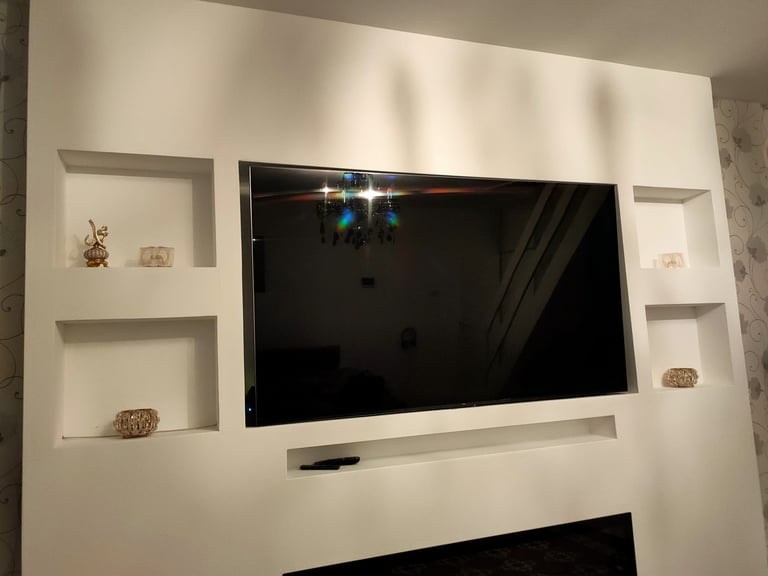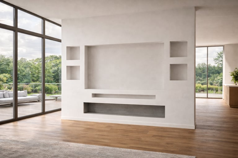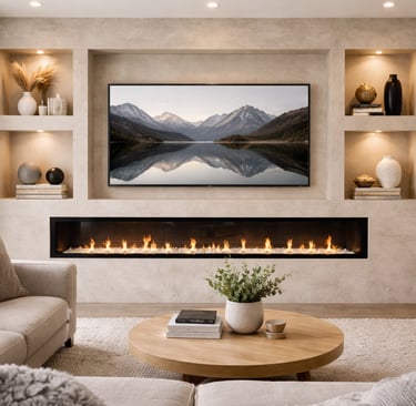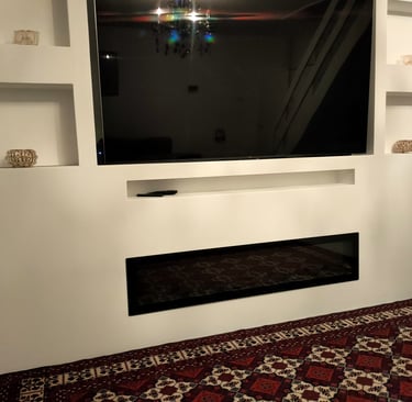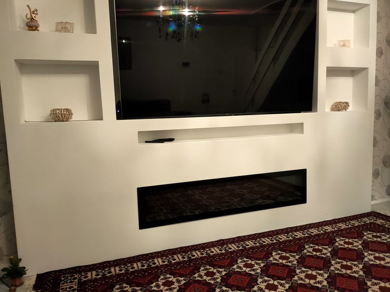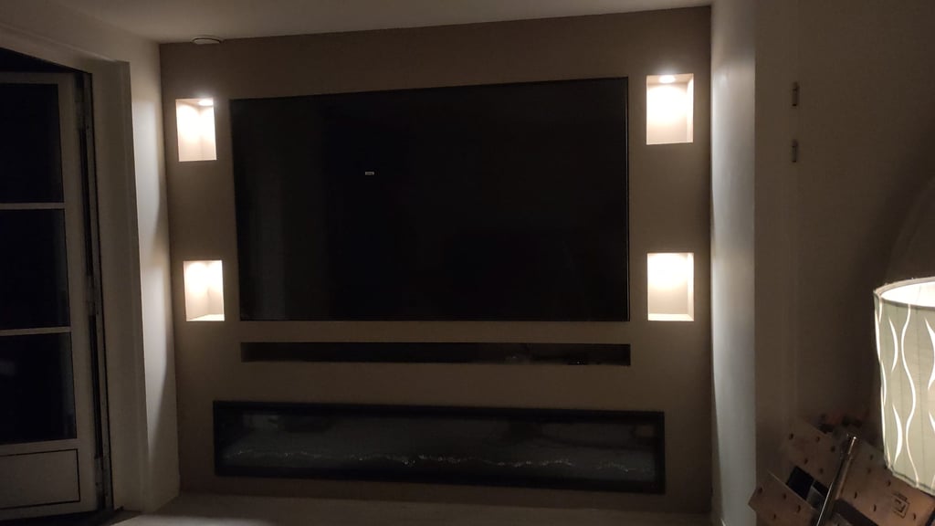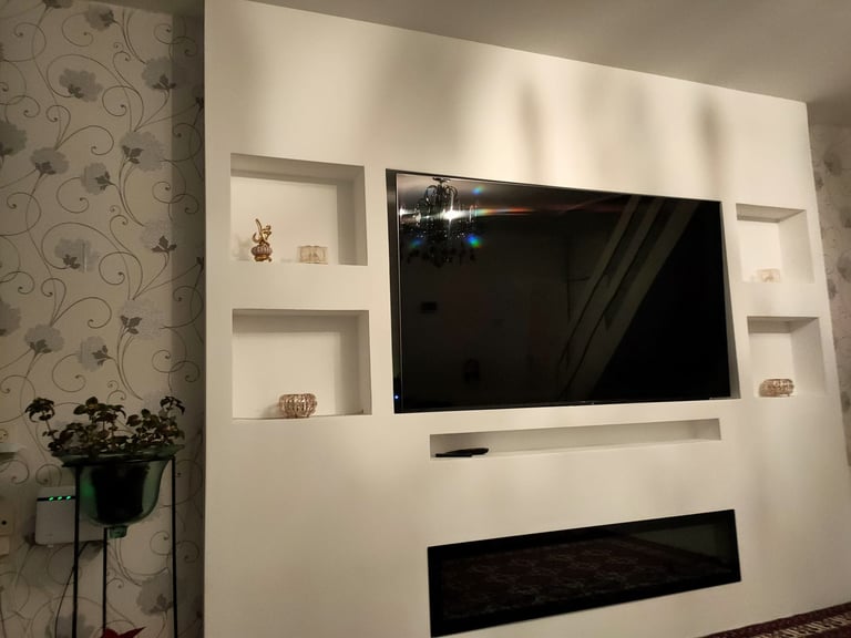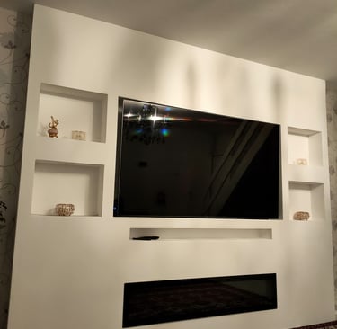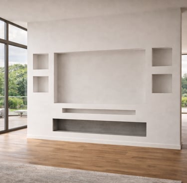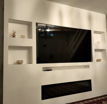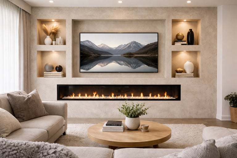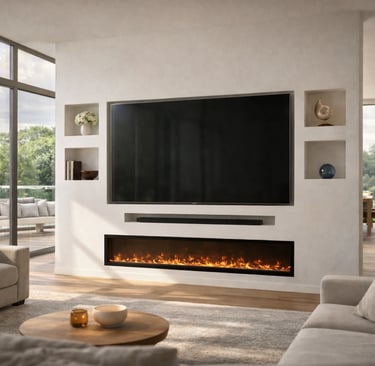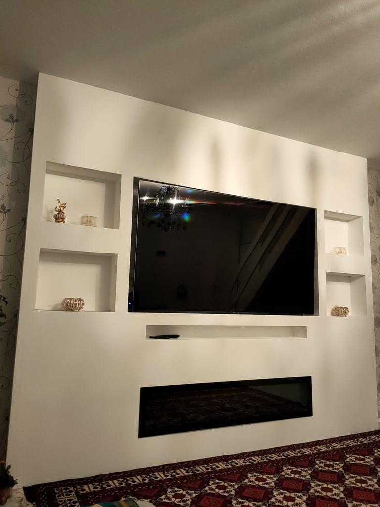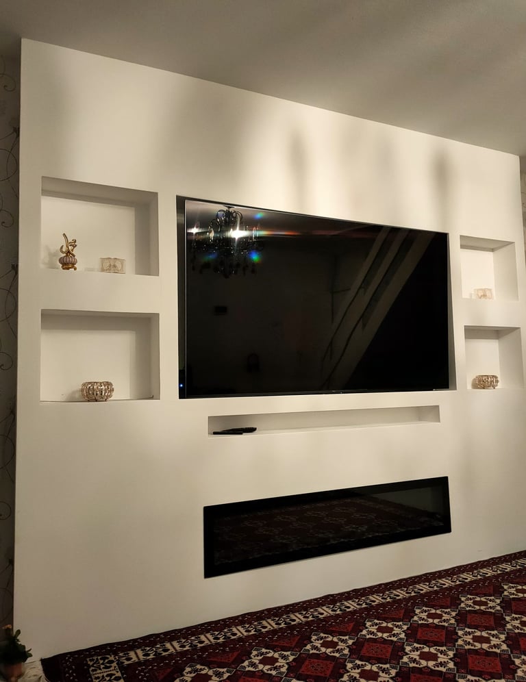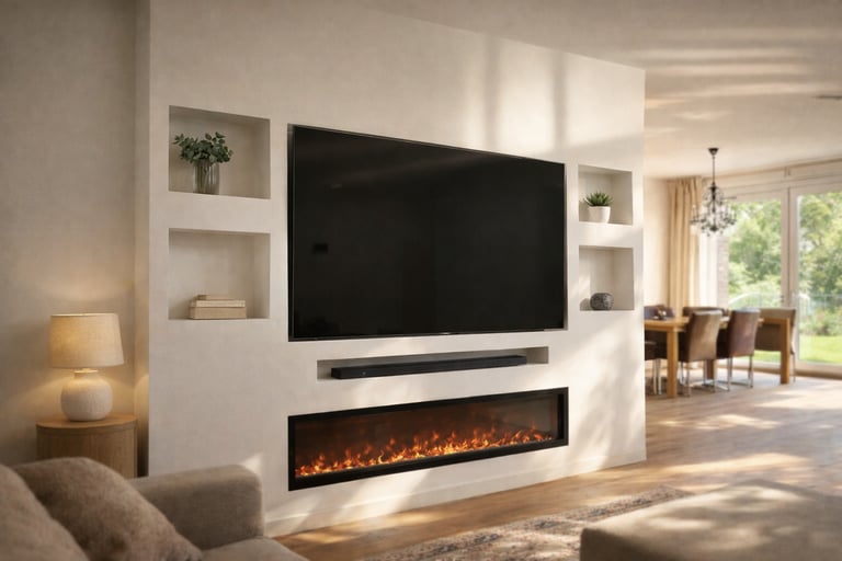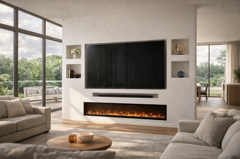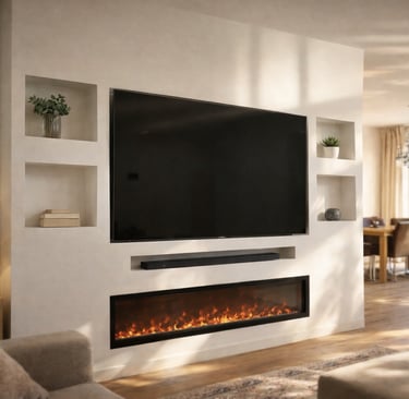 De geïntegreerde nissen aan beide zijden geven het ontwerp extra diepte en bieden ruimte voor decoratie, accessoires of sfeerverlichting. De televisie is strak verwerkt in het midden van de wand, terwijl de elektrische haard onderaan zorgt voor warmte en een luxe uitstraling zonder concessies te doen aan het minimalistische design.