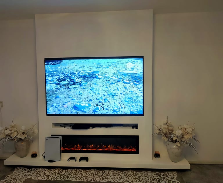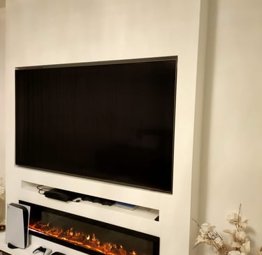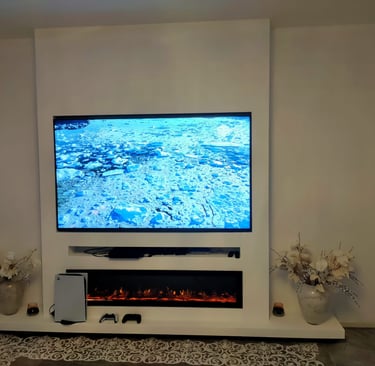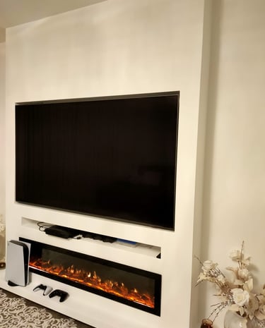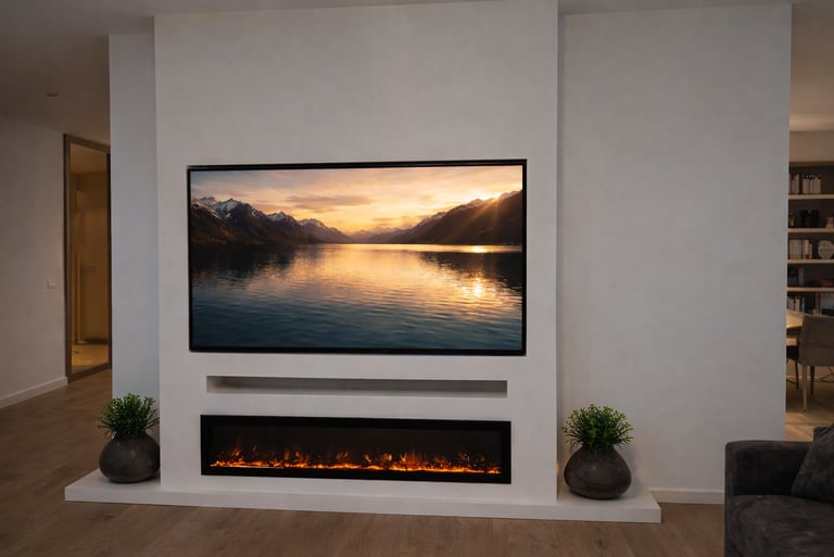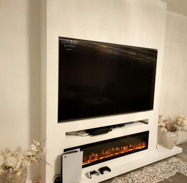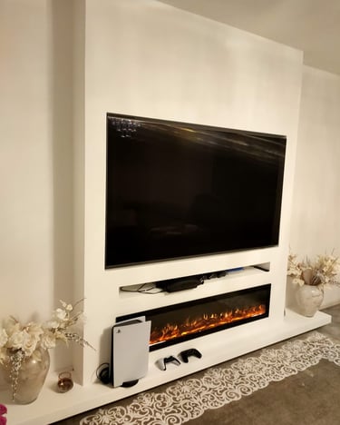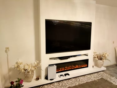 De televisie (75 inch) vormt één geheel met de wand, terwijl de geïntegreerde elektrische haard (152 cm) zorgt voor sfeer en warmte – zonder in te leveren op minimalisme. Doordat het meubel zwevend is uitgevoerd, blijft de vloer vrij en oogt de ruimte licht en open.